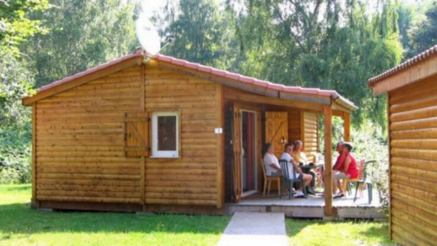 Extérieur : terrasse en bois semi-couverte avec salon de jardin.