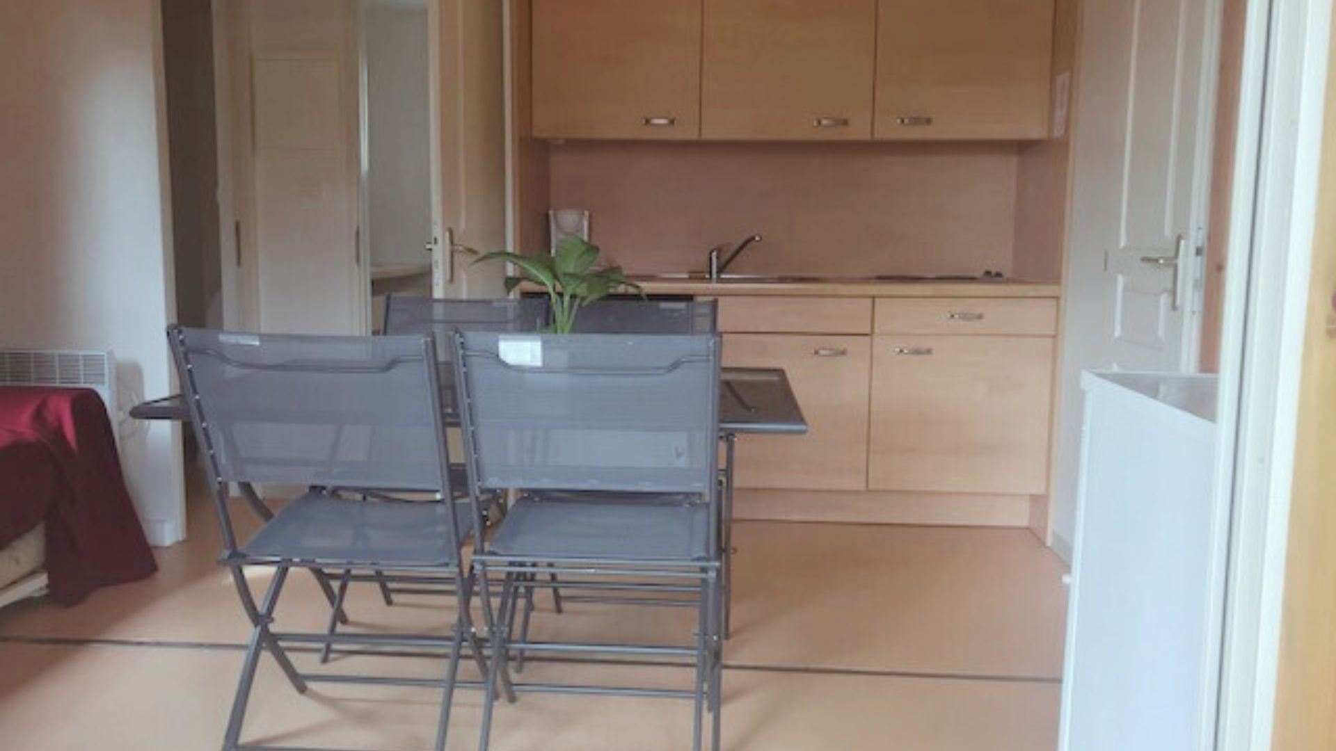Coin cuisine/séjour : cuisine équipée : évier, plaque électrique, réfrigérateur/congélateur, micro-ondes, cafetière à filtre, vaisselle, chauffage dans toutes les pièces et TV.